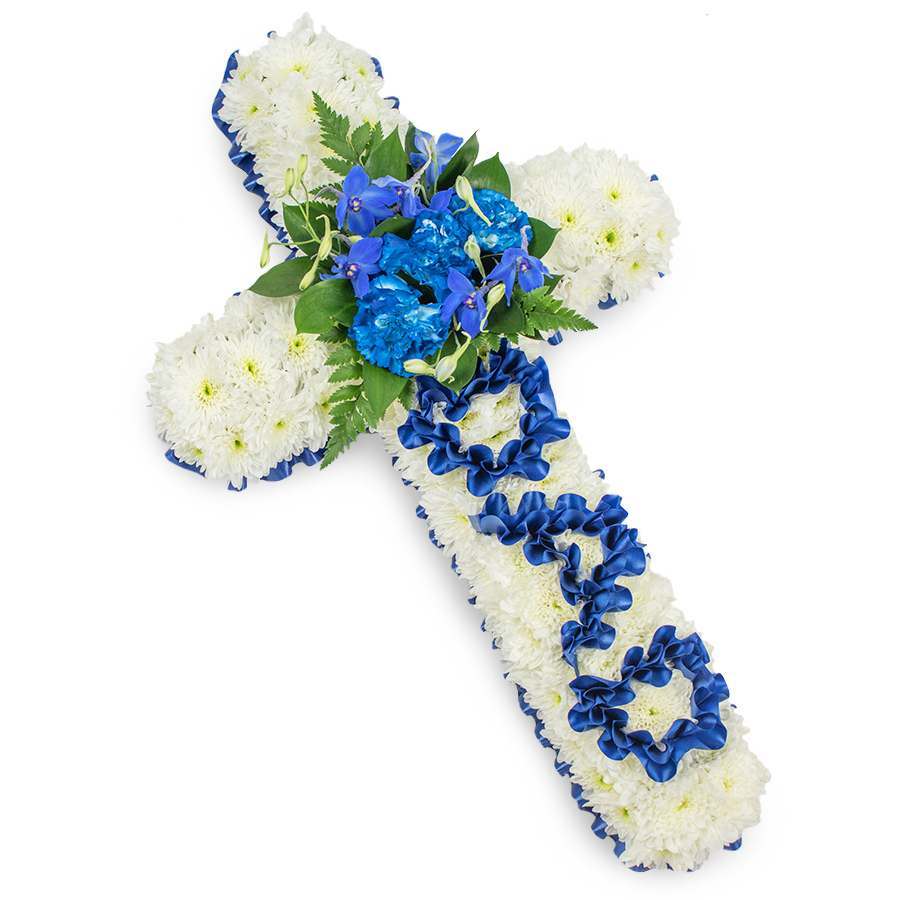 Perfect for funerals, memorials or graveside tributes, this Dad floral arrangement offers a heartfelt way to say goodbye and celebrate a life well lived. Each tribute is created by our expert florists in Barkingside with premium, fresh flowers for lasting beauty throughout the service. Approximate dimensions: Length 60cm (24"), Width 45cm (18").