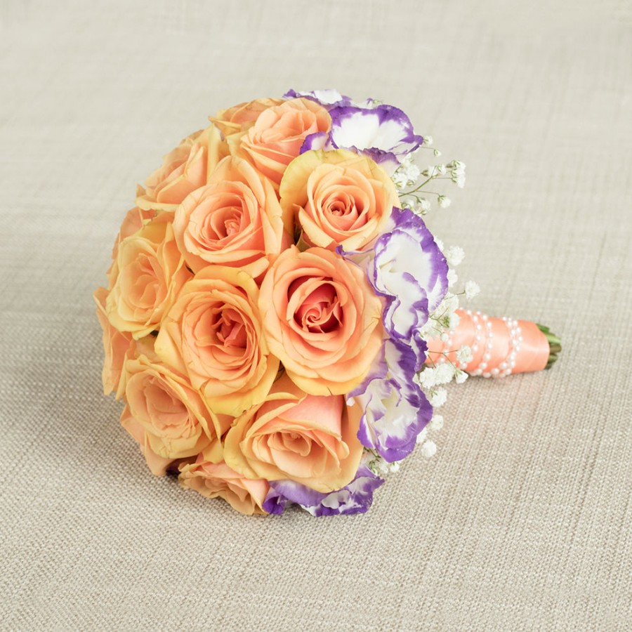 Illuminate your bridal look with our radiant bouquet, combining the vibrant hues of sweet peach orange roses, the subtle elegance of white-purple lisianthus, and the delicate touch of gypsophila. Each flower is hand-selected for ultimate freshness and superior quality, ensuring a bouquet that's both stunning and unique.